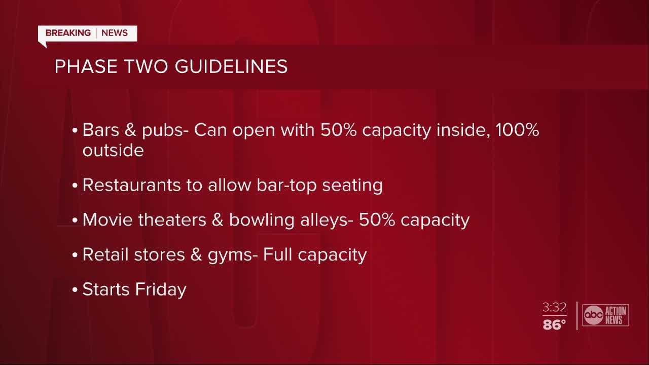 TAMPA, Fla. — Friday marks the first day of Florida's Phase II of Governor Ron DeSantis' "SAFE. SMART. STEP-BY-STEP" plan to reopen the state.